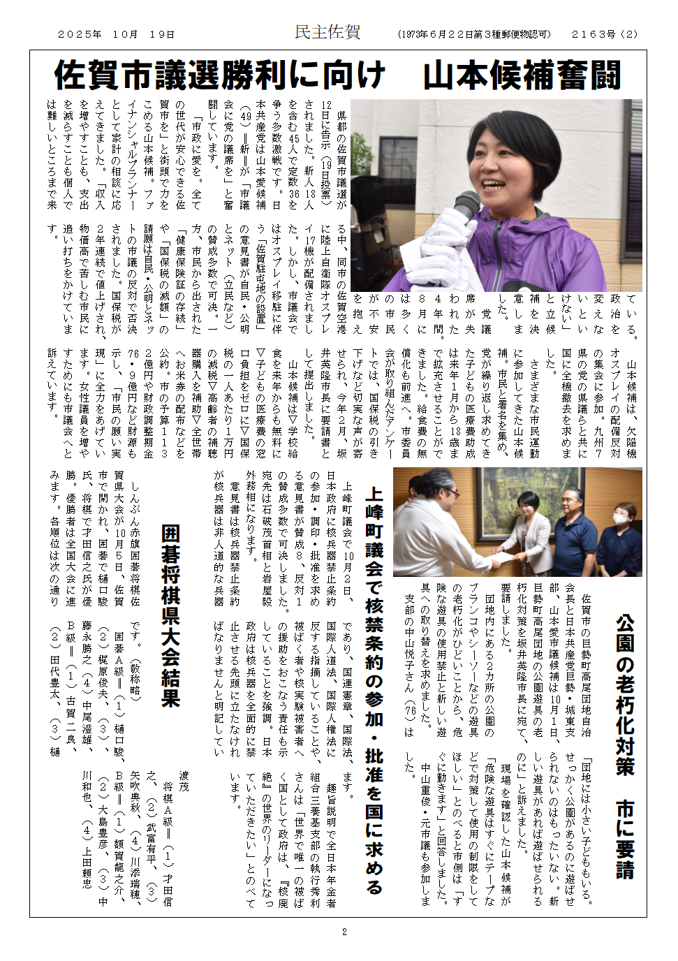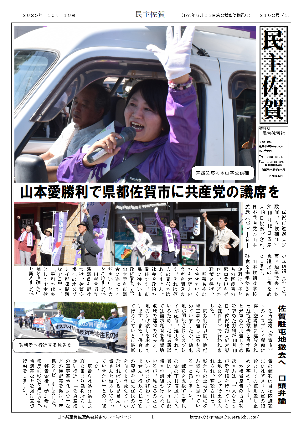 10月19日投開票された県都の佐賀市議選で日本共産党の山本愛候補が当選。4年間空白となっていた党議席が復活しました。市長選挙は無投票となり、坂井英隆氏(45)=自民・立民・公明県本部推薦=の再選が決まってます。