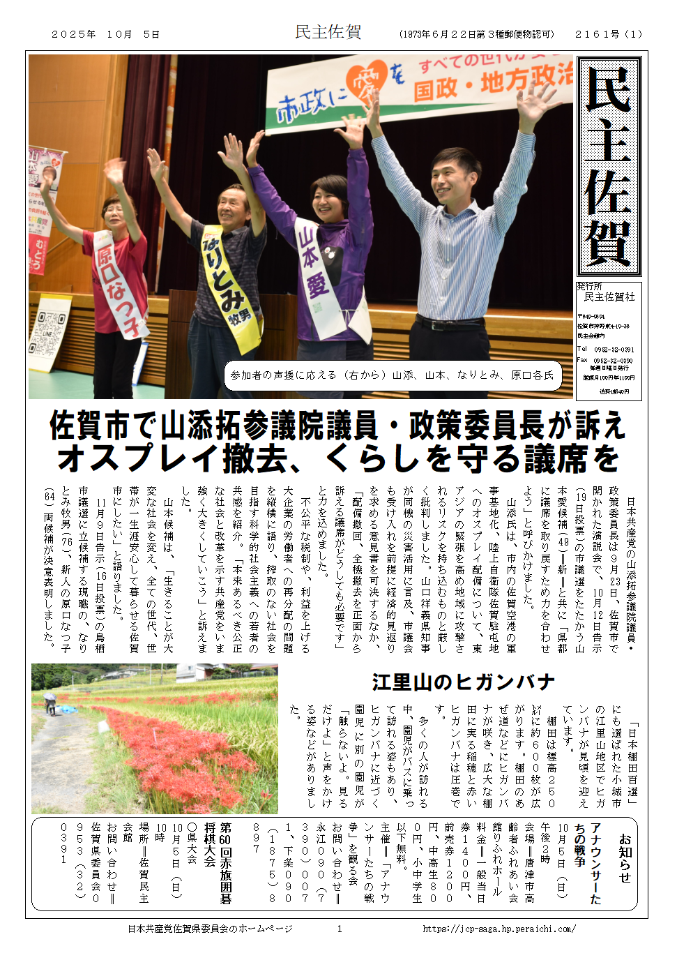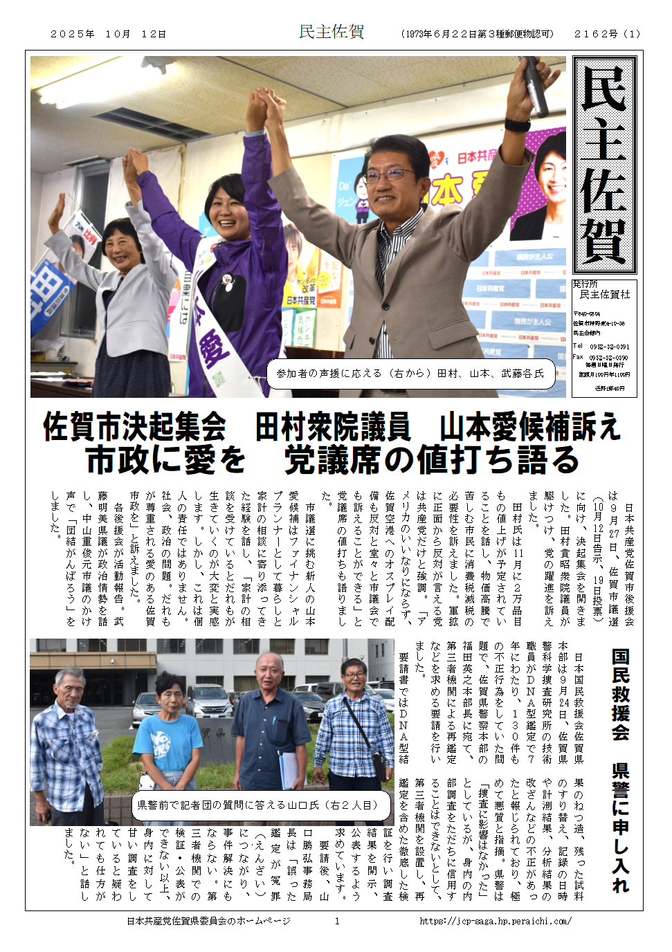 佐賀市議選(定数36、立候補45)が10月12日告示(19日投票)され、日本共産党の山本愛氏(49)=新=が立候補しました。前回選挙で失った党議席の回復をめざします。
