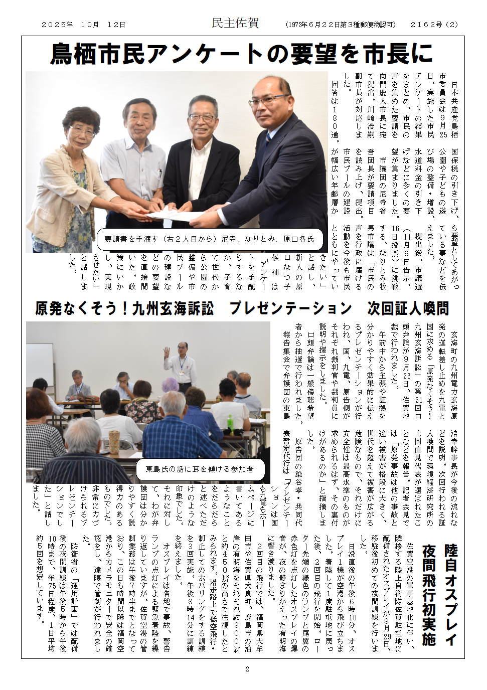 両候補は、県内で2番目の財政力を誇る鳥栖市なのに、市民のための税金の使い方ではないと指摘。尼寺省吾議員から議席の引き継ぎを目指す原口なつ子予定候補は教員歴40年の経験を生かしながら「子どもの医療費を完全に無償にしたい」と訴え。5期目を目指す、なりとみ牧男予定候補は高すぎる国保税や介護保険料など住民の負担軽減を主張しました。