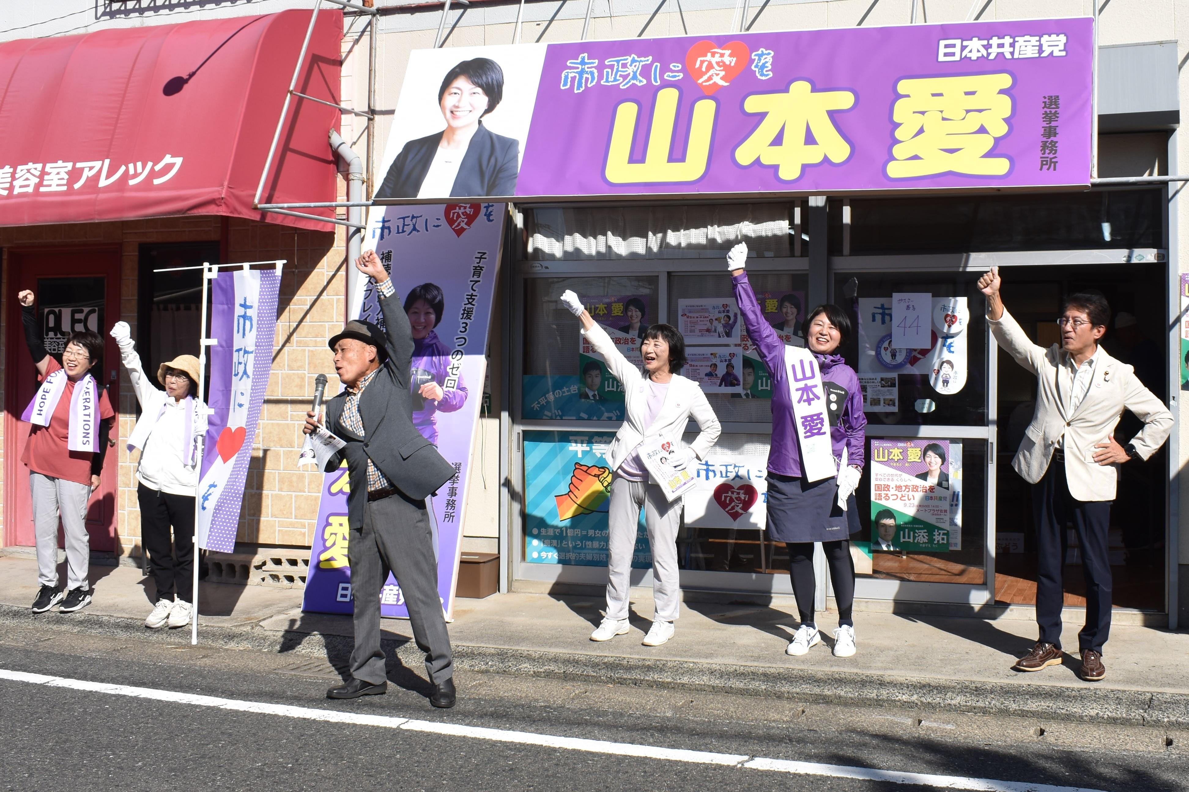 山本候補は学校給食を来年からも無料に、子どもの医療費の窓口負担をゼロに、などの政策を掲げ、「貯蓄も少なく生きていくのも大変という声を聞きます。それは個人の責任ではありません。社会や政治の責任です。市民に冷たい市政に愛を。私、山本愛を市議会に送ってください」と力をこめました。